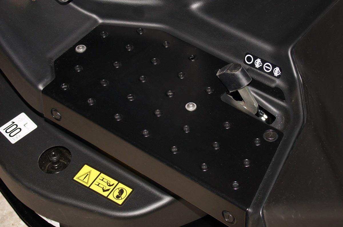 Das 102 cm breite Mähdeck mit 2-Messer-System sorgt für ein perfektes Schnittbild und enorme Flächenleistung. Darüber hinaus kann der Mähvorgang noch schneller abgeschlossen werden, da der grosse Fangkorb mit 400 Litern Fassungsvermögen seltener geleert werden muss.