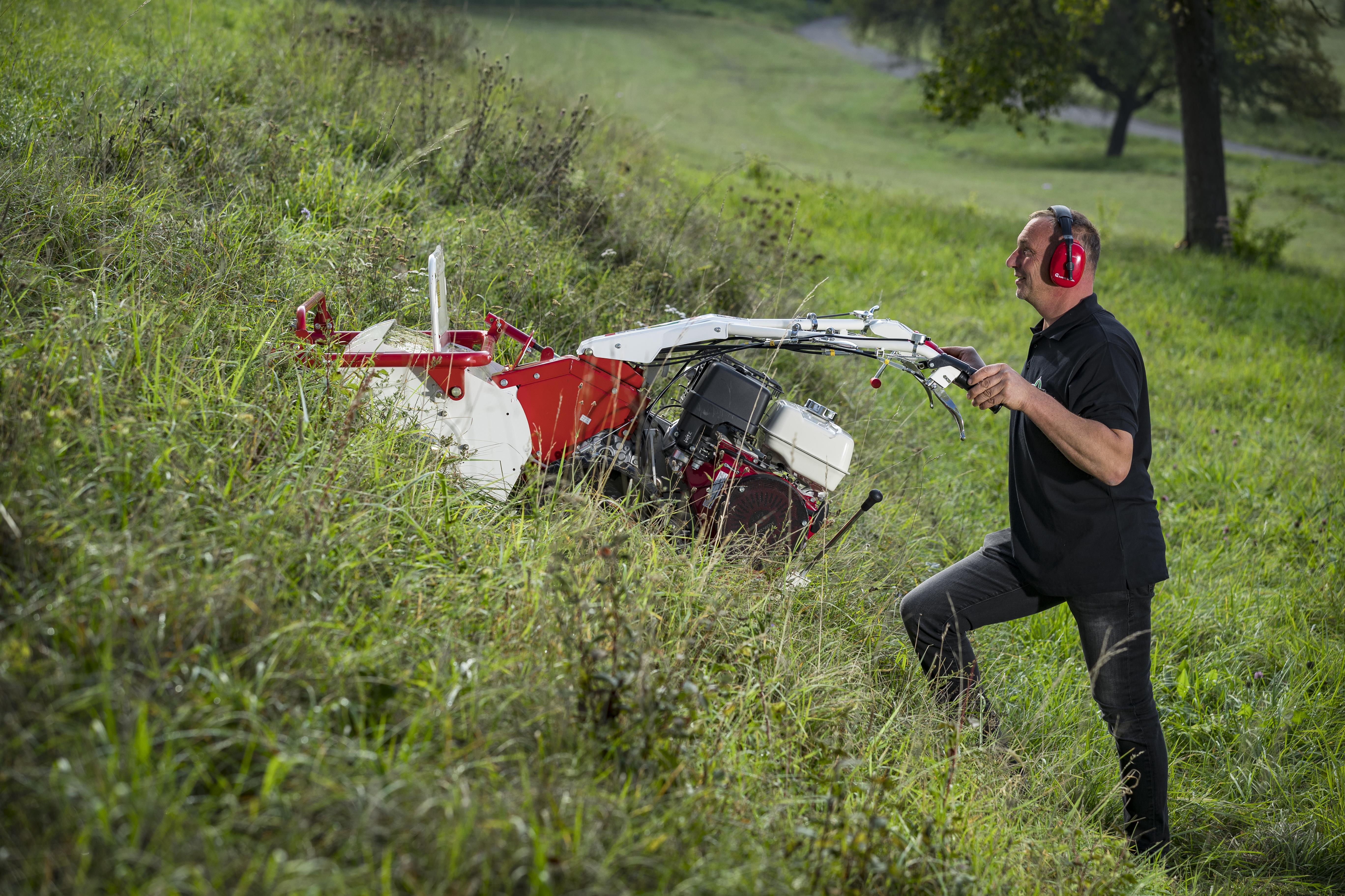 Die OREC Schlegelmäher meistern problemlos dichtes Gestrüpp und hohes Gras. Das Schnittgut wird durch die Y-Messer besonders fein zerkleinert und gleichmässig über die gesamte Schnittbreite abgelegt. Für perfekte Traktion auch auf weichem Boden sorgt ein speziell angeordnetes, auseinandergezogenes Ackerstollenprofil auf den breiten Antriebsrädern. Der Führungsholm des Mähers ist dank Quick-Schnellverstellung auch während der Arbeit unkompliziert in Höhe und Seite zu verstellen. Der getrennte Mäh- und Fahrantrieb und das schaltbare Getriebe ermöglichen eine Anpassung der Geschwindigkeit an die gegebenen Verhältnisse, ohne dabei die Mähleistung zu reduzieren. Die Klappe am Mähdeck öffnet sich automatisch bei höherem Strauchwerk. Die Einzelradkupplung für komfortable Lenkmanöver und der niedrige Schwerpunkt der Maschine sorgen für hohe Wendigkeit.
