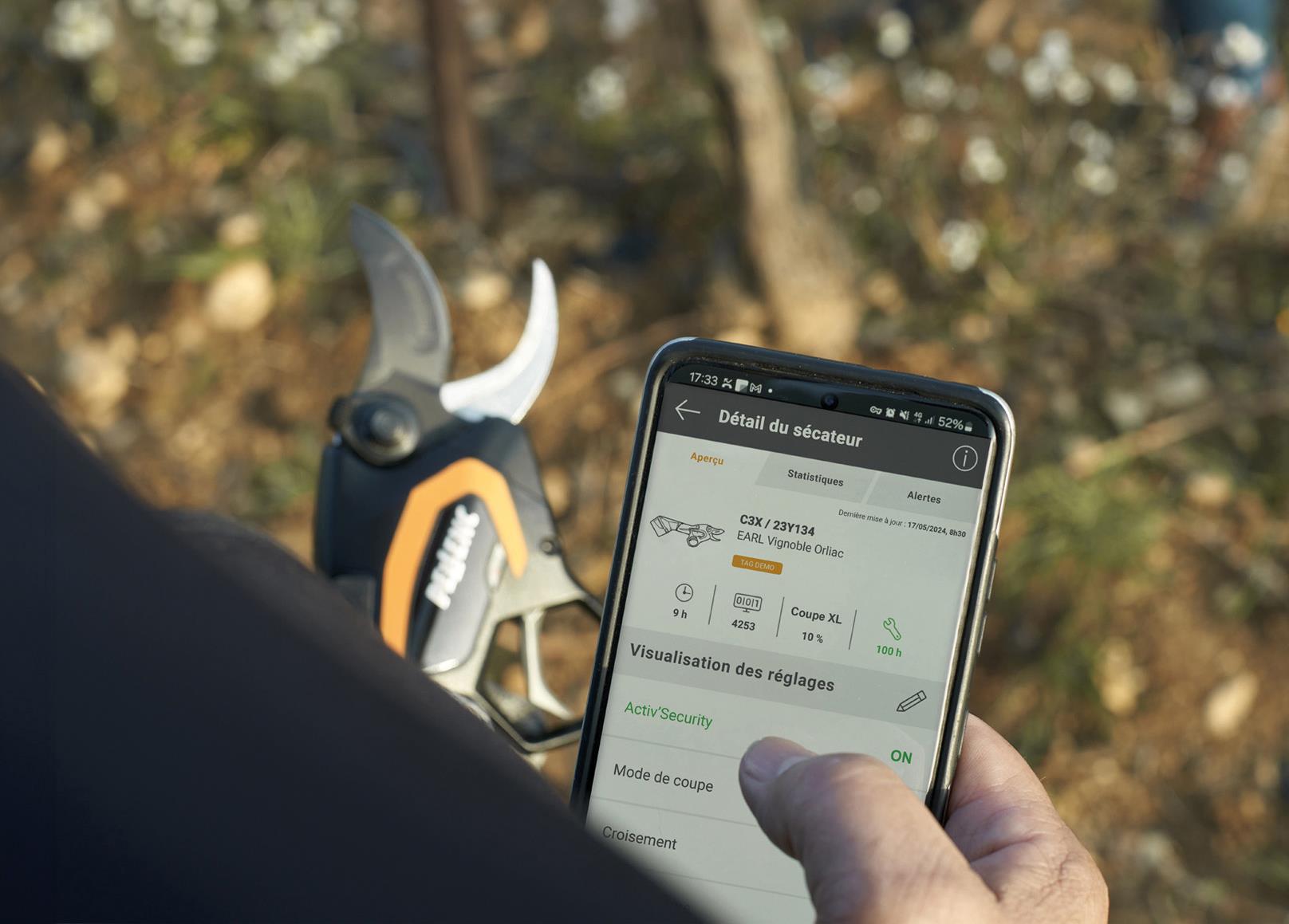 - Mit neuer PELLENC-App (kostenfrei): Alle Statusdaten und Einstellungen der Schere schnell und übersichtlich direkt am Smartphone!“