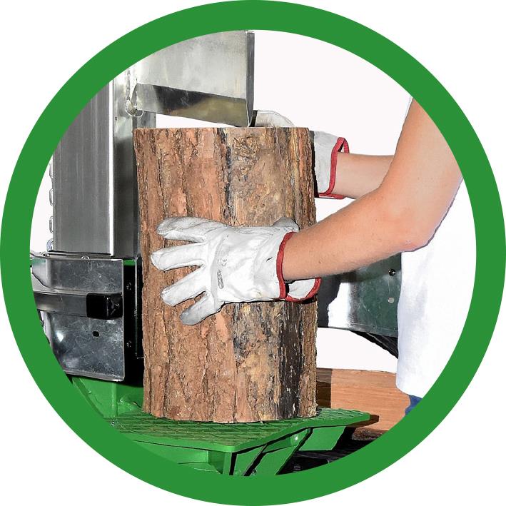 Das System-LEADER garantiert höchsten Bedienkomfort: Durch leichten Druck auf das Fusspedal fährt das Spaltmesser selbsttätig nach unten, während beide Hände frei bleiben. Sobald das Messer das Holzstück berührt, hält es an und fixiert das Material sicher. Der eigentliche Spaltvorgang wird anschliessend über die beiden Bedienhebel ausgelöst.