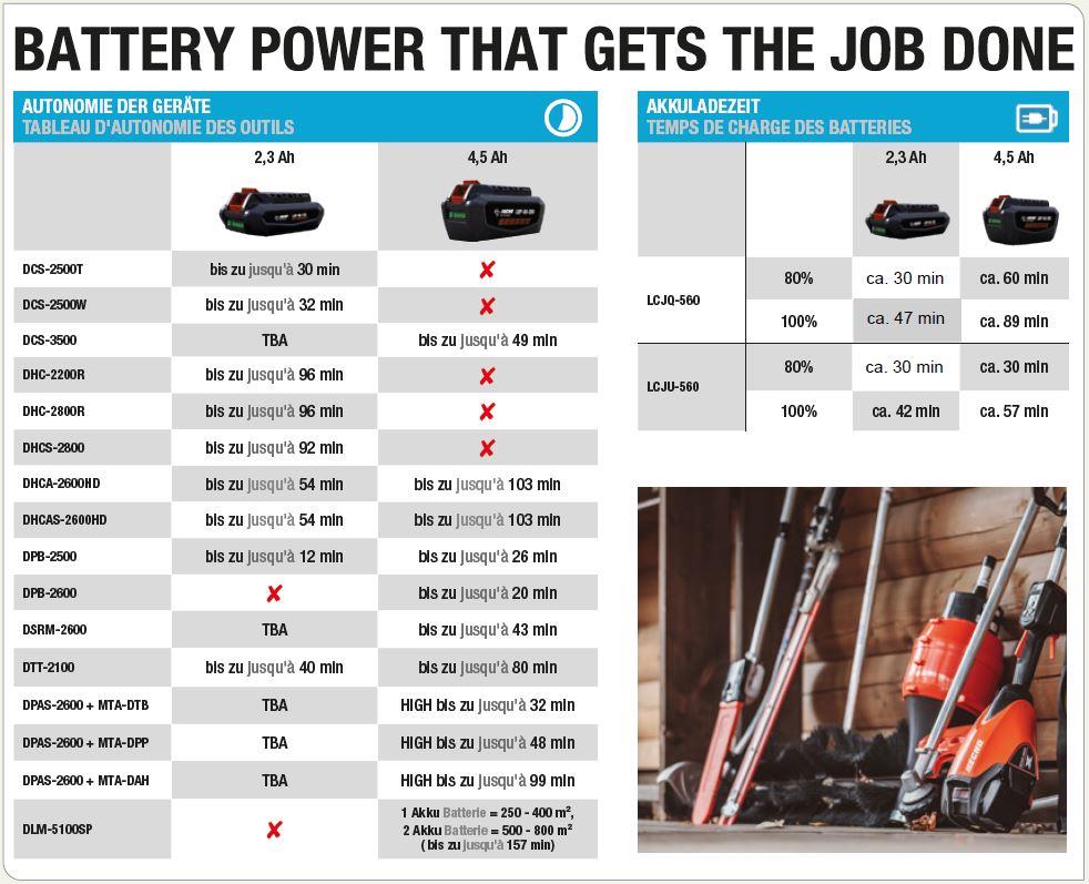 Le DPAS-2600 se distingue par sa haute performance et sa batterie lithium-ion puissante, qui assure une longue durée de fonctionnement et un temps de charge rapide. Le système est particulièrement convivial et permet un changement rapide des accessoires accouplements, vous permettant de réagir rapidement aux exigences changeantes.