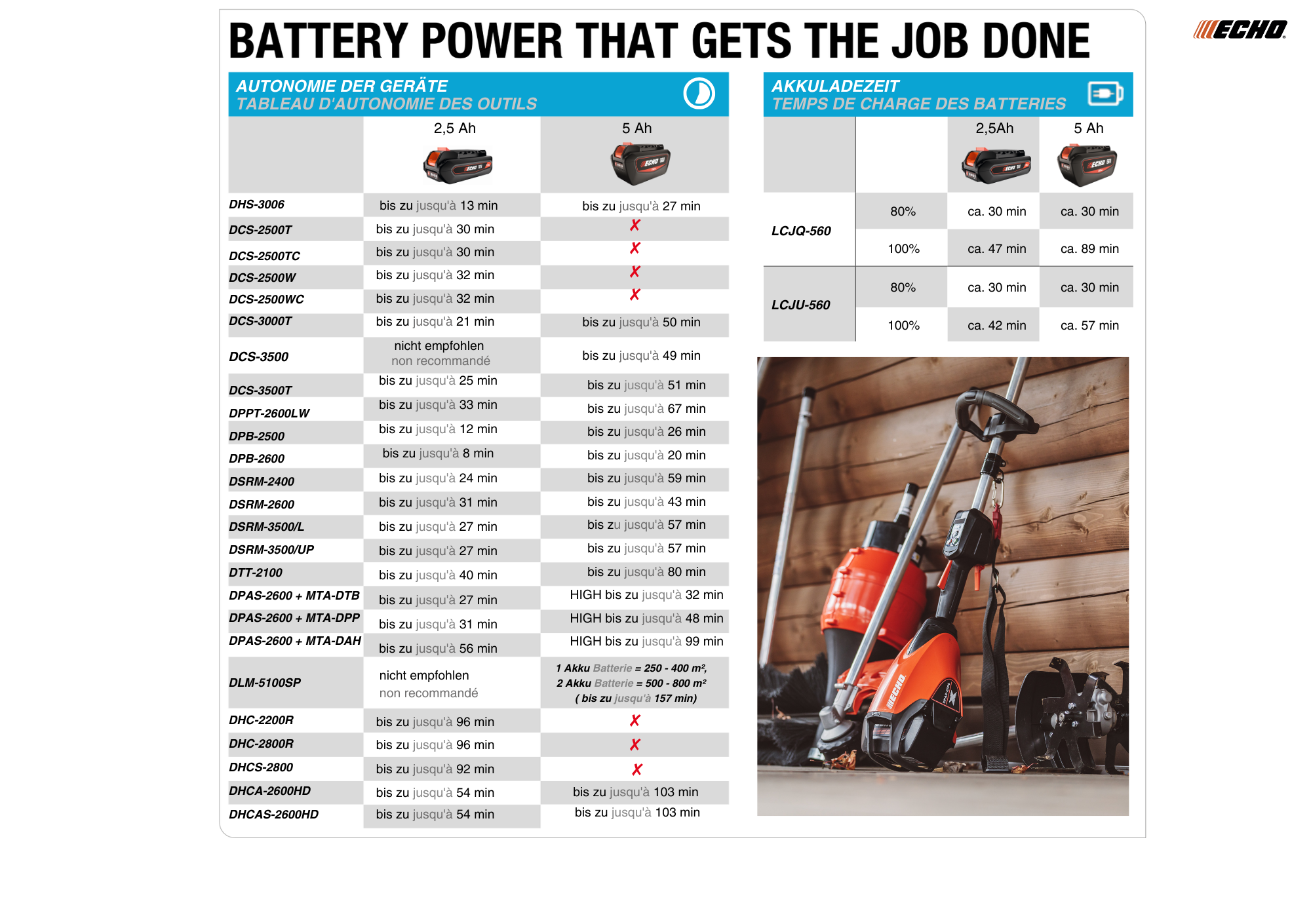Avec la DSRM-2600L d'ECHO, vous bénéficiez d'un appareil robuste et fiable, caractérisé par une longue durée de vie et un entretien minimal. La technologie de batterie sans fil permet non seulement de réduire les coûts, mais aussi de protéger l'environnement en éliminant les émissions nocives.