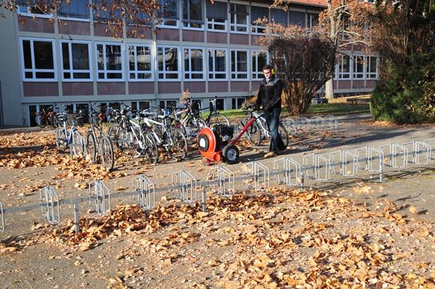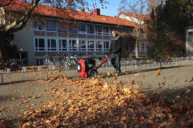 Souffleur mobile pour feuilles, herbe, paille et autres matériaux en vrac. Le flux d'air peut être réglé vers le haut pour souffler les feuilles résiduelles des buissons. Le large rouleau d'appui ne laisse pas de traces de passage sur les sols mouillés. La direction de soufflage est réglable en continu depuis le guidon. Le guidon est réglable en hauteur. En outre, l'appareil est doté d'un système d'amortissement des vibrations pour un travail confortable.