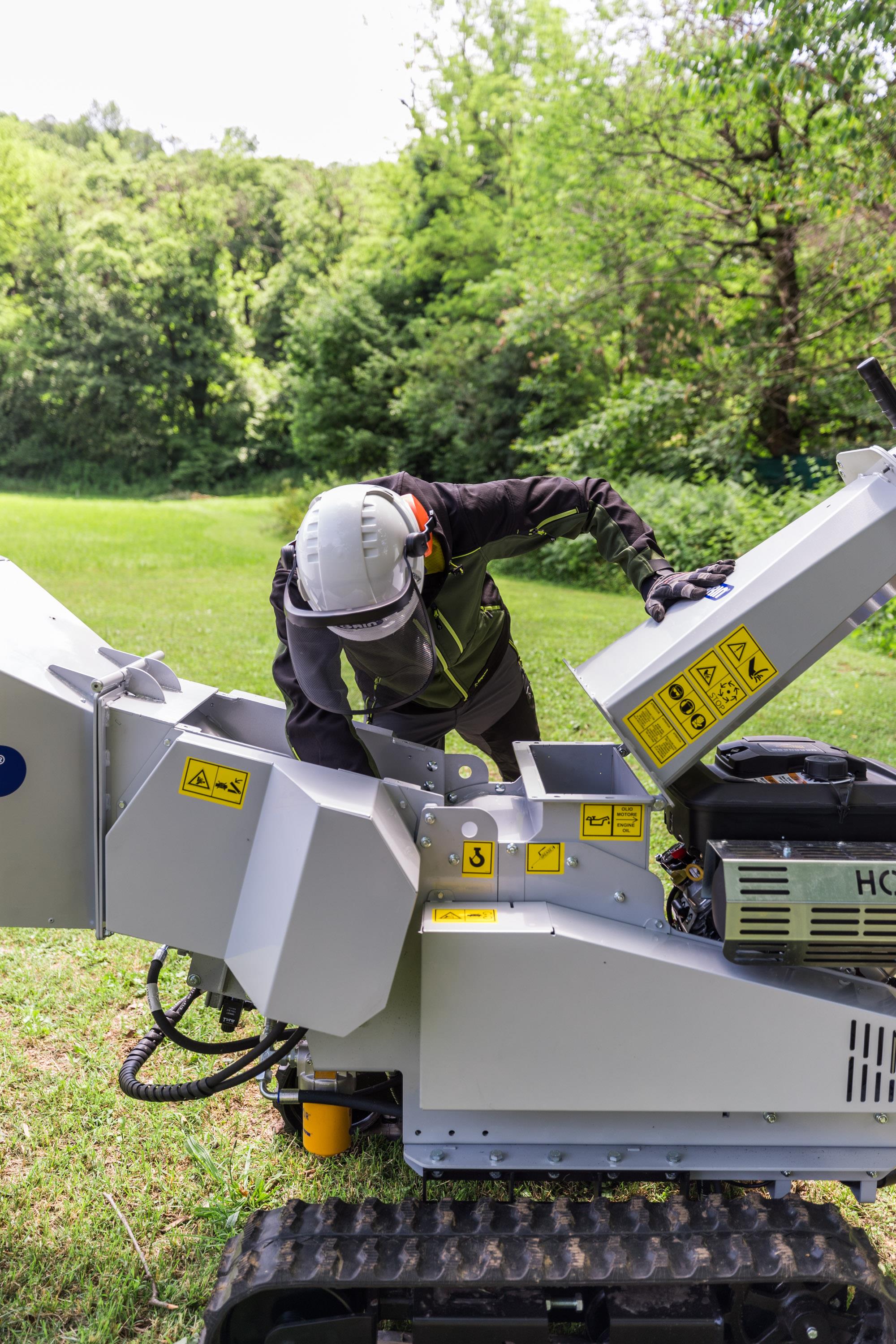La trémie longue et large permet d’introduire de branches longues et fibreuses sans opérations supplémentaires et sans devoir réduire leurs dimensions avant d’être chargées dans le système de coupe. Cela permet d’accélérer considérablement les opérations de chargement. Pendant le transport et l’entretien, la trémie peut être repliée, ce qui réduit considérablement l’encombrement.