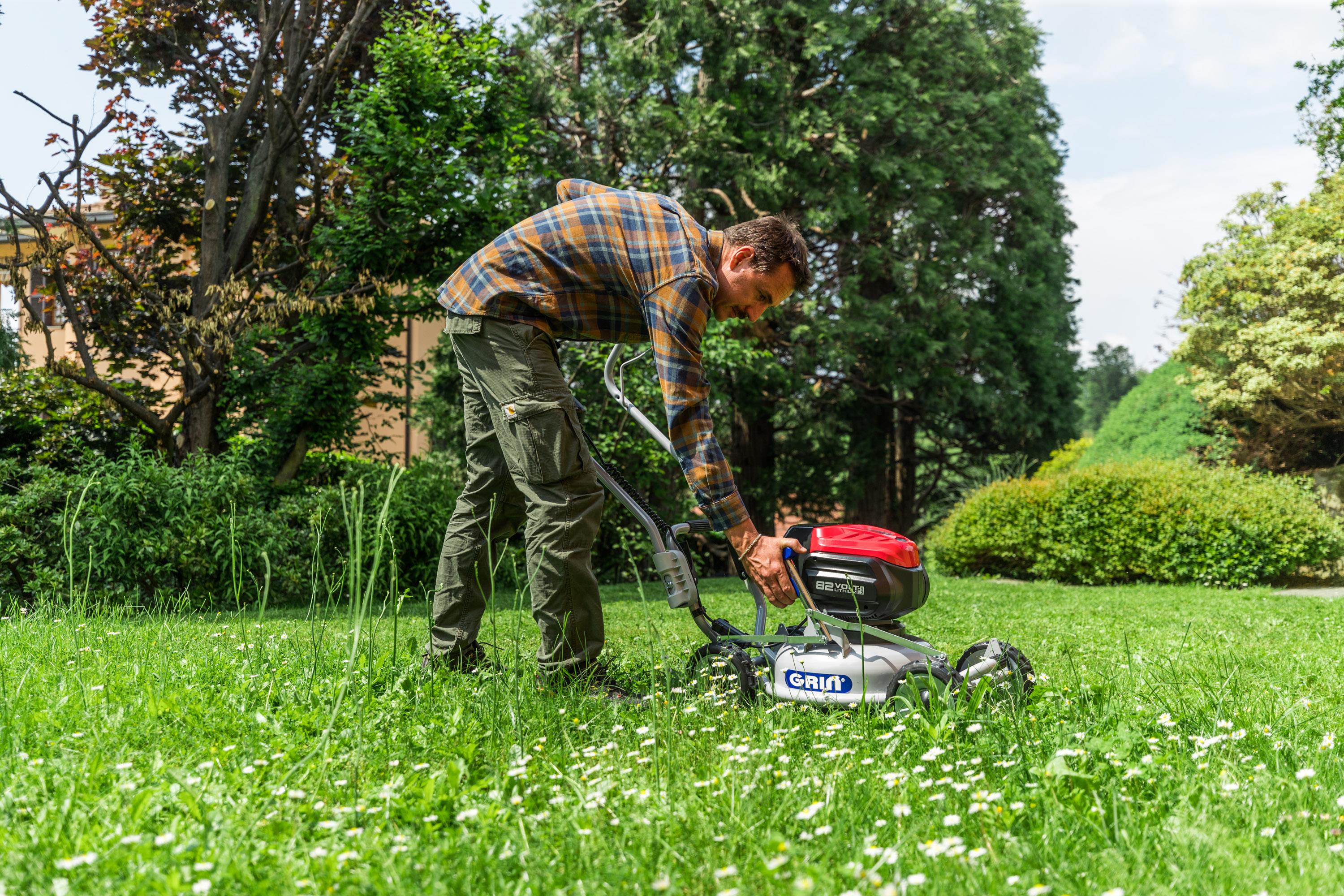 La GRIN BM37-82V est une tondeuse équipée du moteur électrique Cramer alimenté par une batterie aux ions de lithium de 82V et 2,5Ah qui permet, en conditions normales de tonte, de tondre jusqu’à 500/600 m² de pelouse avec une seule recharge. Fabriquée sur le châssis éprouvé GRIN, elle monte un moteur électrique de 1,5 kW, pouvant atteindre des performances élevées équivalentes à celles d’une tondeuse thermique, même en conditions de tonte difficiles. En fonction des efforts requis, la variation du régime moteur de 2600 à 2900 tr/min permet d’optimiser la durée de la batterie. La structure de cette machine est identique à celles des tondeuses GRIN thermiques. La GRIN BM37-82V est l’outil idéal pour les petits espaces, les finitions et les situations qui requièrent une diminution substantielle du bruit, des émissions polluantes et des frais d’entretien du moteur.