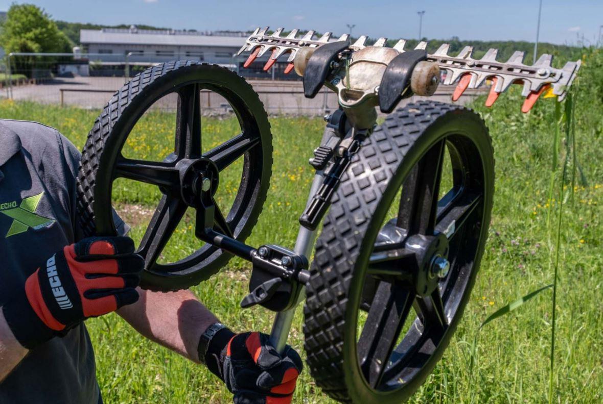 Pour préserver la biodiversité des plantes, des insectes et des amphibiens, il est nécessaire d'entretenir les espaces verts et les biotopes en douceur. Avec l'ECHO DTT-2100 et le jeu de roues de support en option, cela est possible sans effort. Les grandes roues d'appui offrent un excellent guidage sur les terrains accidentés et permettent de travailler beaucoup plus facilement.