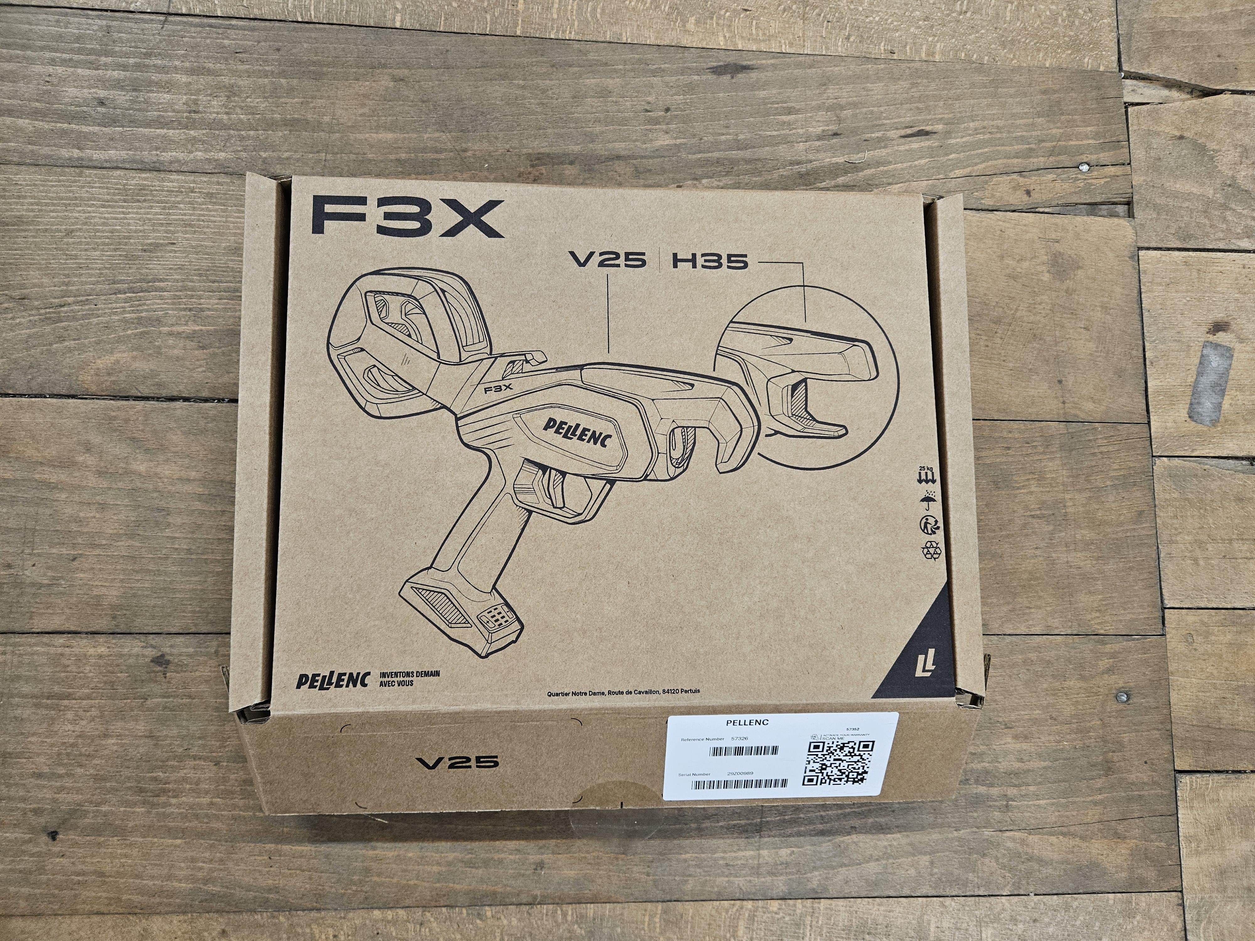 La livraison comprend carton : 1 × F3X V25, dérouleur amovible de 80 m, ciseaux spéciaux et chargeur NOMAD MOBIL