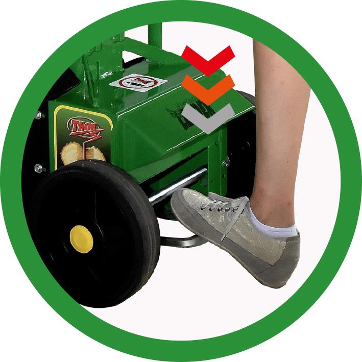 Le dispositif de commande System-LEADER permet l’abaissement du couteau de fendage par une pression réduite sur la pédale, laissant les mains libres. Dès que le couteau entre en contact avec le morceau de bois, il s’arrête et le maintient fermement. Le processus de fendage est ensuite activé par l’actionnement des deux leviers de commande.